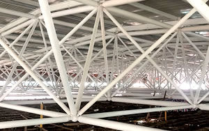 球形網(wǎng)架施工方案 1、工程概況和總體部署 網(wǎng)架采用正放四角錐形式,采用螺栓球接點(diǎn),采用普通鋼管材,采用兩側(cè)焊接水平支座...